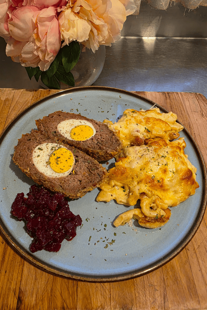 This recipe is a lovely reminder that traditional home cooking often makes the most of what’s already in the kitchen. Seasoned sausage meat wraps around soft-boiled eggs. They are coated in crisp golden crumbs. They’re hearty, filling, and surprisingly straightforward to make.